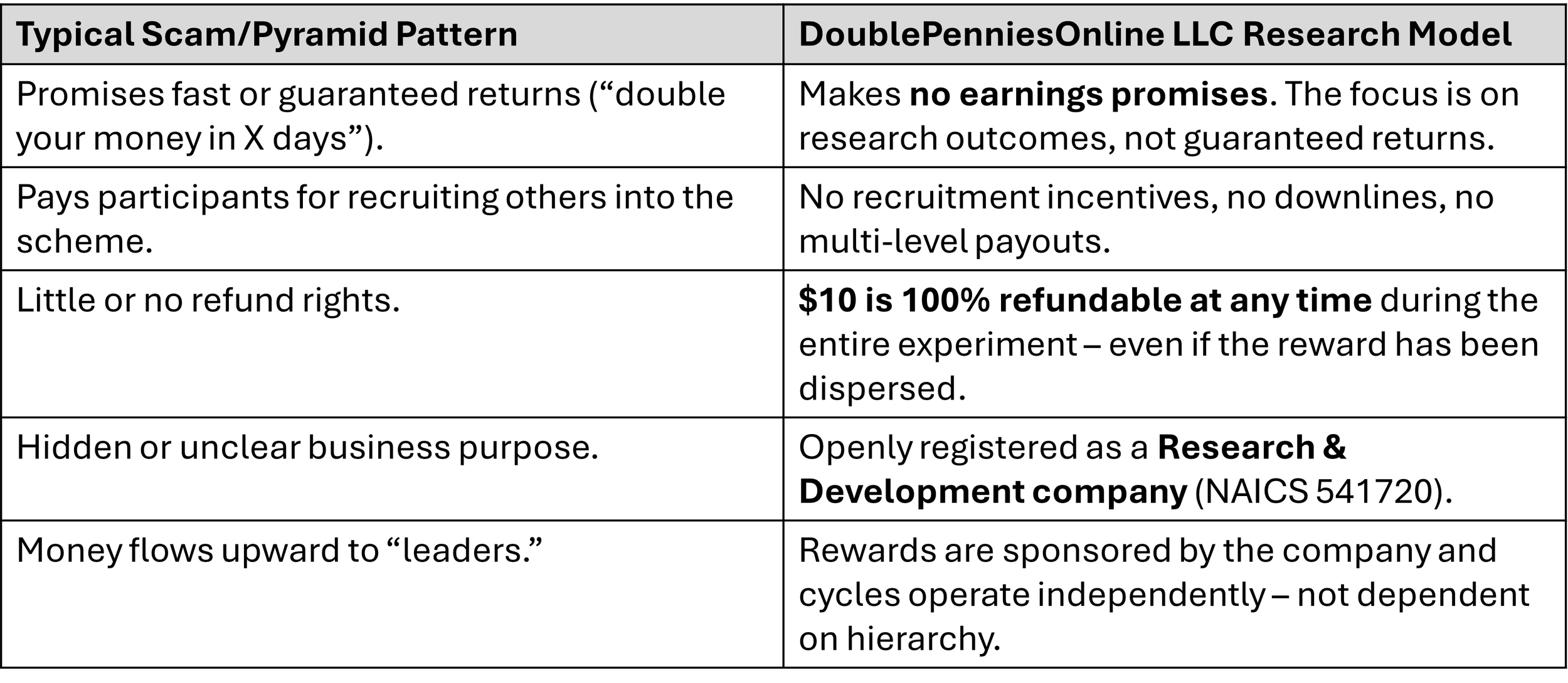 We understand why people ask. Historically, many scams misused the idea of “doubling money.” But DoublePenniesOnline LLC is a registered economic R&D company with documented protections, transparent terms, and a 100% refund guarantee at any time.